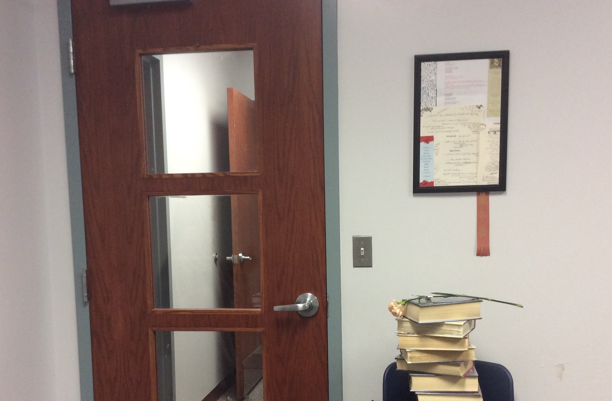 Stack of books near door.